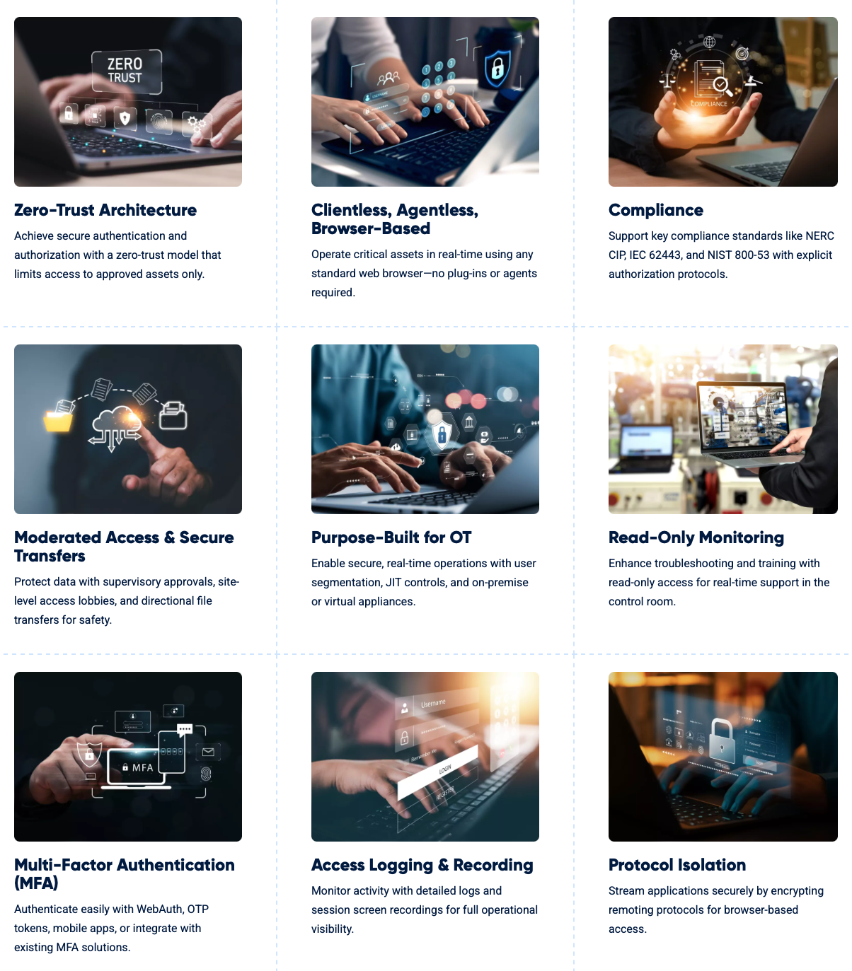 - Comply with industry regulations such as NERC CIP, IEC 62443, and TSA SD2.